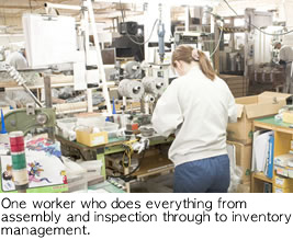 - We employ a food stall production system to make products. The production line of each product is like a food stall with an owner (worker). A large advantage of the food stall production system is that it changes the attitude of the worker. The division of labor system assigns each of the workers a special assignment such as scheduling, preparation of parts, assembly, and packing. The food stall production system, on the other hand, allows one worker to do everything from parts management through to delivery date management, so he or she has a stronger sense of responsibility. Furthermore, workers are able to get to know their customers clearly so their attitude to the work will change from passive to active and the motivation will increase. Several years have passed since we changed the division of labor system to the food stall production system, and defects have decreased dramatically and quality has improved.