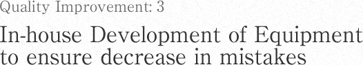 - We make assembly machines and inspection equipment in-house so more than a half of all the machinery and equipment were made in-house. We identify workplaces where mistakes such as confusion regarding the number of screws and mounting in the reverse direction are likely to take place or actually took place, or where the work load on workers can be reduced, and make and use special jigs in such workplaces to prevent defects. Furthermore, we make inspection equipment to suit each product in-house to ensure that products are made without any mistakes.